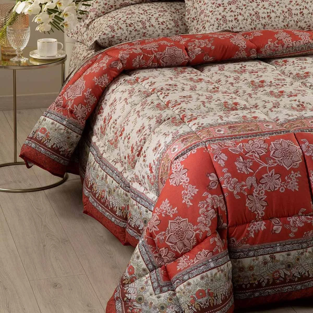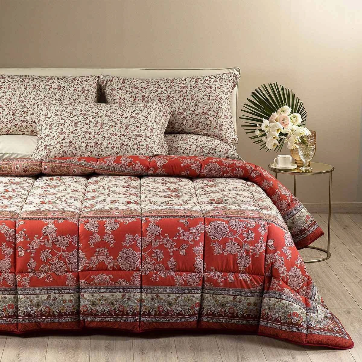 La trapunta Tuscany di Caleffi è una garanzia di qualità. Grazie al suo tessuto in puro cotone e all’imbottitura in fibra di poliestere anallergica, si adatta infatti anche alle pelli più sensibili. Il suo motivo floreale nei toni del rosso, crea un’atmosfera calda ed invitante nella camera da letto.