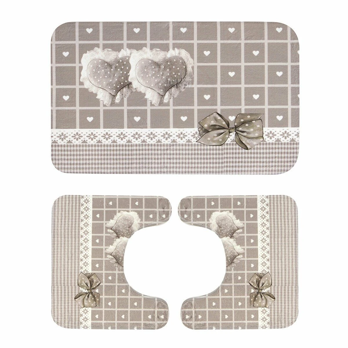 I fiocchi e i cuori fanno da protagonisti su questo set di tappetini da bagno. Doneranno un tocco di romanticismo alla tua sala da bagno e il fondo in pvc antiscivolo li renderà stabili e sicuri.