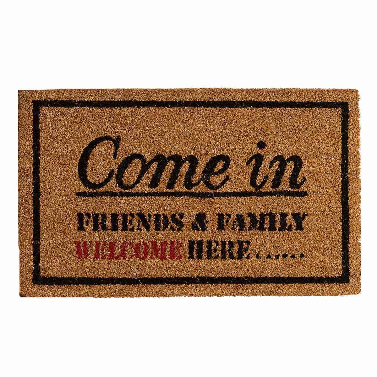 | Dettagli | La confezione contiene un tappeto/zerbino in cocco con retro gommato antiscivolo Scritta stampata in contrasto di colore “Come in friends e family welcome here” Forma rettangolare Multiuso, ideale per l’esterno e gli ingressi Ottima resistenza nel tempo |